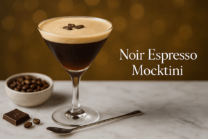 Noir Espresso Mocktini — café frio, baunilha e espuma. Harmoniza: chocolate 70% & noz-pecã.